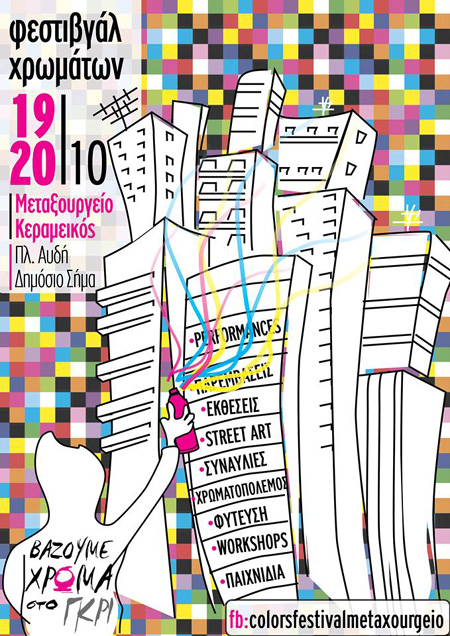 To Σάββατο 19 και την Κυριακή 20 Οκτωβρίου θα λάβει χώρα στο Μεταξουργείο το 2ο Φεστιβγάλ Χρωμάτων, μια πανήγυρις χρώματος και μουσικής με συναυλίες, εικαστικές παρεμβάσεις, φυτεύσεις, στριιτ αρτ,τσίρκο, bollywood dancing, χρωματοπόλεμο και "καυτερές" φωτογραφίες! Είναι μια απόπειρα των ανθρώπων που δρουν,ζουν και δημιουργούν σε αυτή τη γειτονιά του κέντρου της Αθήνας να συμπυκνώσουν την καθημερινή δημιουργία σε μια πανδαισία χρώματος, σαν αυτή του Μεταξουργείου, ανθρώποι κάθε χρώματος σε μια μικρή γειτονιά του κέντρου της Αθήνας, ένα ζωντανό κολάζ που ανασαίνει.