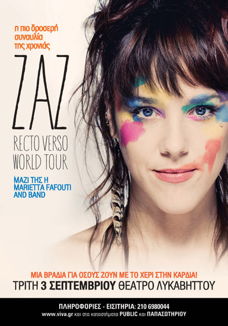 Ο πρώτος δίσκος της Zaz έφθασε στο #1 των γαλλικών chart, επιβεβαιώνοντας την εξαιρετική αποδοχή ενός γνήσιου ταλέντου και δημιουργώντας ήδη μεγάλες προσδοκίες για τη συνέχεια. Και η συνέχεια ήρθε. Με νέα τραγούδια αλλά και με την γνωστή αγάπη της να διασκευάζει γνωστά κι αγαπημένα τραγούδια από το γαλλικό και όχι μόνο ρεπερτόριο, έρχεται για δεύτερη φορά στην Ελλάδα, στο θέατρο Λυκαβηττού.