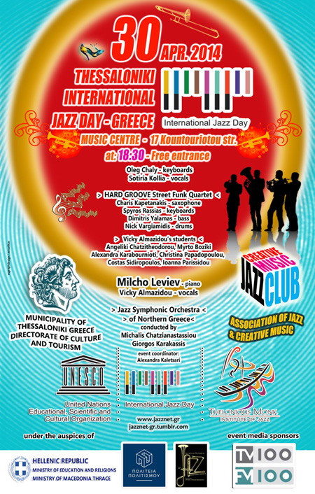 Ο Σύλλογος "Φίλοι της Τζαζ & Δημιουργικής Μουσικής" (Association of Jazz & Creative Music) και η Διεύθυνση Πολιτισμού Τουρισμού του Δήμου Θεσσαλονίκης υπό την αιγίδα της Πολιτείας Πολιτισμού και την υποστήριξη των Υπουργείων Παιδείας και Θρησκευμάτων καθώς και του Υπουργείου Μακεδονίας Θράκης, διοργανώνει την εκδήλωση "ΠΑΓΚΟΣΜΙΑ ΗΜΕΡΑ JAZZ ΜΟΥΣΙΚΗΣ (ΔΙΕΘΝΗΣ ΗΜΕΡΑ JAZZ / UNESCO / THELONIUS MONK INSTITUTE OF JAZZ)" στο χώρο του Κέντρου Μουσικής του Δήμου Θεσσαλονίκης, Κουντουριώτου 17 και ώρα 18:30 την Τετάρτη 30 Απριλίου 2014