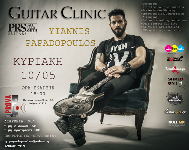 Οι κιθάρες PRS-Greece σε συνεργασία με τα Prova Studios και το Shred on σας προσκαλούν σε ένα μοναδικό σεμινάριο με τον Yiannis Papadopoulos (Session Guitarist/Teacher/Solo Artist) το οποίο θα πραγματοποιηθεί την Κυριακή 10 Μαιου στις 18:00 στα Prova Studios Κωνσταντινουπόλεως 56 στον Ταύρο.