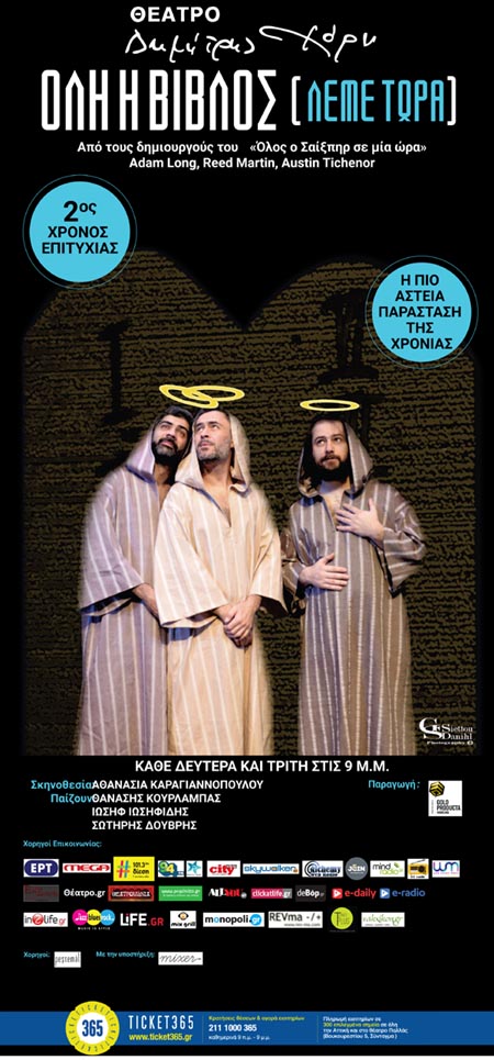Μετά την επιτυχία τους «Όλος ο Σαίξπηρ σε μία ώρα», οι συγγραφείς Α.Long, R.Martin, A.Tichenor, συμπύκνωσαν όλη τη Βίβλο (The Bible: The Complete Word of God- abridged) σε μία κωμωδία που έσπασε ταμεία σε Αμερική και Αγγλία, για πολλά χρόνια. Το 2015, χρονιά – ορόσημο για τη χώρα μας, παρουσιάζεται για πρώτη φορά και για ένα μήνα σε Αθηναϊκό Θέατρο, σημειώνοντας μοναδική επιτυχία.