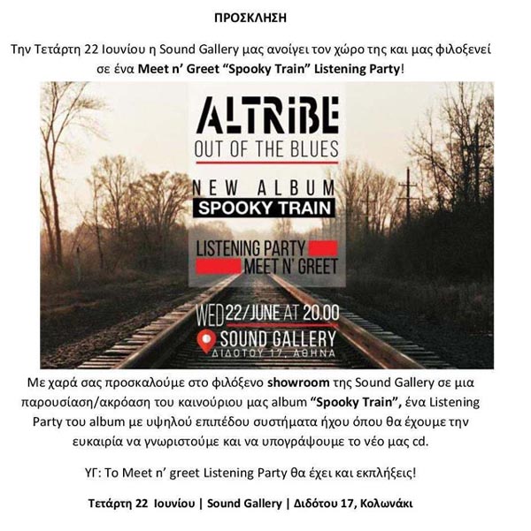 Ελάτε να ακούσουμε το καινούριο μας CD "Spooky Train", το οποίο ήδη έχει κερδίσει κοινό και κριτικούς, και να γνωριστούμε από κοντά, με εκπλήξεις μουσικές αλλά και γευστικές!