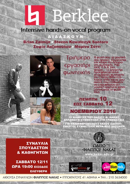 Η φωνή σου: το μουσικό σου όργανο. Εξερεύνησε τον κόσμο της σύγχρονης φωνητικής. Pop, rock, R & B, jazz, gospel... Το εργαστήρι προσφέρεται στους σπουδαστές φωνητικής του Ωδείου Φίλιππος Νάκας αλλά και σε μουσικούς που επιθυμούν να εντρυφήσουν στη μουσική ερμηνεία χρησιμοποιώντας τη φωνή τους. Διδάσκουν δύο σπουδαίοι περφόρμερς - καθηγητές του Berklee College of Music, ο Brian Zalmijn και ο Steven Kowalczyk Santoro σε συνεργασία με τις καθηγήτριες μοντέρνου τραγουδιού του Ωδείου Φίλιππος Νάκας Μαρίνα Σάττι και Σοφία Λαζοπούλου.