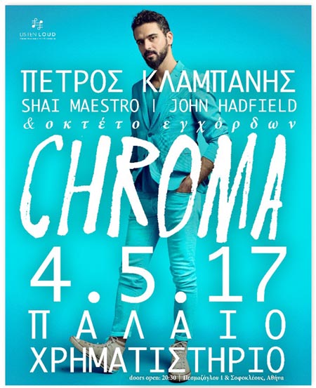 4 Μαΐου | Chroma, Πέτρος Κλαμπάνης live. Ένα live υψηλής καλλιτεχνικής απόλαυσης, μια βραδιά που θα χρωματίσει ο καθένας με το δικό του προσωπικό φάσμα, μια μουσική εμπειρία που θα μείνει ανεξίτηλη στη μνήμη μας.