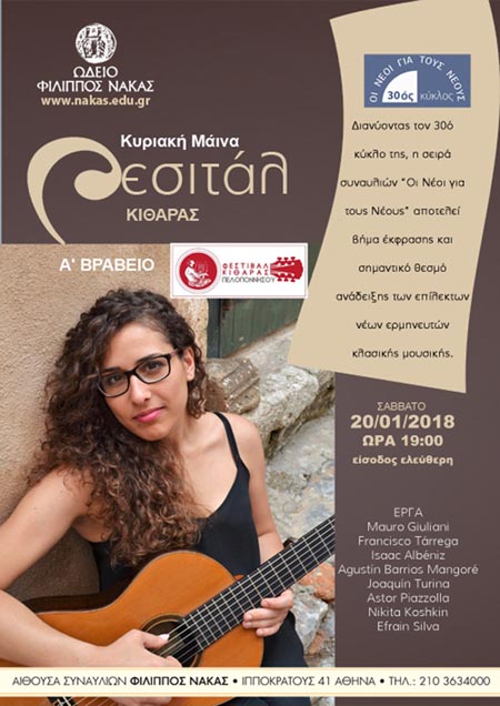 Η Κυριακή Μάινα δίνει το σημερινό της ρεσιτάλ έχοντας αποσπάσει το Α' Βραβείο στην κατηγορία "σολίστ" στο 2ο Φεστιβάλ Κιθάρας Πελοποννήσου που πραγματοποιήθηκε με μεγάλη επιτυχία τον Φεβρουάριο του 2017.