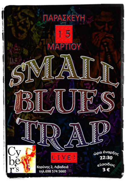 Μετά από 15 χρόνια παρουσίας στις μουσικές σκηνές της Ελλάδας, οι SMALL BLUES TRAP έρχονται στο CYBER’S για να παρουσιάσουν ένα πρόγραμμα το οποίο περιλαμβάνει δικά τους τραγούδια που έχουν καταγραφεί δισκογραφικά στα albums "Our Trap"(2005), "Crossroad Ritual"(2006),"Red Snakes & Cave Bats"(2010),"The Longest Road I Know"(2013) και "Time Tricks"(2015) έχοντας λάβει ενθαρρυντικά σχόλια τόσο απ' τον εγχώριο όσο κι απ' το διεθνή μουσικό τύπο, καθώς και τις ιδιαίτερες διασκευές τους σε τραγούδια των Muddy Waters, Albert King, Howlin’ Wolf, Memphis Minnie, Eddie Taylor, Chuck Willis, J.J.Cale, Jimi Hendrix, The Doors, Nick Gravenites, Tom Waits…κ.α.