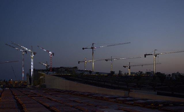 Κατασκευαστικοί γερανοί σε ρόλο χορευτή στο εργοτάξιο του Κέντρου Πολιτισμού.
