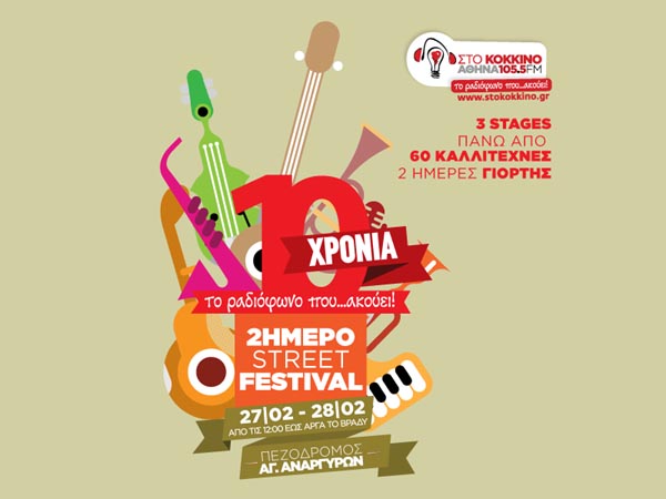 Δύο ημέρες γεμάτες μουσική και δρώμενα στη γειτονιά που για δέκα συνεχόμενα χρόνια το σήμα μας εκπέμπει δυνατά! Ένα φεστιβάλ δρόμου με ακούσματα από εναλλακτική rock μέχρι ρεμπέτικο, από λαϊκό μέχρι jazz, funk, swing και world που αντανακλούν τη μουσική ταυτότητα του 105,5 Στο Κόκκινο που τον καθιέρωσε ως ένα από ραδιόφωνα με την καλύτερη μουσική της πόλης. Παράλληλα θεατρικές παραστάσεις και δραστηριότητες για παιδιά.