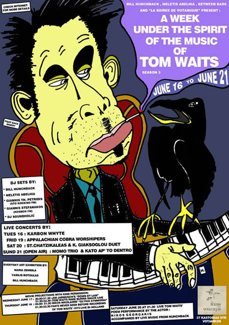 Και φέτος το αφιέρωμα στη μουσική του Tom Waits θα λάβει χώρα στο La Soiree de Votanique τον χώρο που τα τελευταία δύο χρόνια φιλοξενεί με ιδιαίτερη επιτυχία το αφιέρωμα υπό τις ευλογίες του ίδιου του Tom Waits, της Antirecords και της Epitaph records. Το αφιέρωμα διοργανώνεται όπως κάθε χρόνο από τον Bill Hunchback τον Meletis Abelhia και την ραδιοφωνική εκπομπή τους Between Bars (κάθε Δευτέρα 13.00-15.00 στο Beton7 Art Radio) και περιλαμβάνει live μουσικές, εικαστικές εκθέσεις, προβολές, performances, συζητήσεις και πολύ μουσική που είτε έγραψε και ερμήνευσε είτε εμπνεύστηκε ο Tom Waits. Αυτό που συνδέει τα καλλιτεχνικά events του αφιερώματος είναι το πνεύμα της μουσικής του Tom Waits, η βροχή, οι έρημοι δρόμοι, το road trip, η φυγή, μια συντροφιά από «απόκληρους» που μοιράζονται μια μπύρα σε ένα παρακμιακό απόμερο bar.