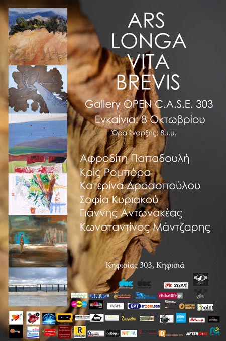 Oι εικαστικοί Γιάννης Αντωνακέας, Κατερίνα Δροσσοπούλου, Σοφία Κυριακού, Κρις Ρομπόρα, Κωνσταντίνος Μάντζαρης και Αφροδίτη Παπαδουλή απαρτίζουν την ομάδα ars longa vita brevis. Στην έκθεση που παρουσιάζουν στην γκαλερί OPEN C.A.S.E. 303 Κηφισίας 303 στις 8 Οκτωβρίου, βλέπει κανείς το αστικό τοπίο και την σχέση που διαμορφώνεται μ'αυτό, τον άνθρωπο και την φύση που δρα με τρόπο απόλυτο, εξουσιαστικό μα και γοητευτικό απάνω του.