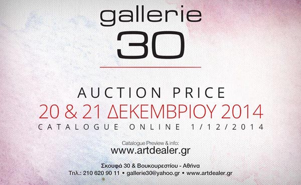 H Gallerie 30 διοργανώνει για τρίτη συνεχή χρονιά σήμερα 20 και αύριο 21 Δεκεμβρίου 2014, το Auction Price δίνοντας στο φιλότεχνο κοινό την ευκαιρία να αποκτήσει έργα διάσημων Ελλήνων ζωγράφων στις καλύτερες τιμές της αγοράς. Οι πόρτες της Gallerie 30 θα είναι ανοιχτές 11:00 – 21:00 καθημερινά, παρουσιάζοντας ένα Preview των έργων από τις 13 Δεκεμβρίου μέχρι και την ημέρα της έναρξης του Auction Price. Προσφέρουμε μια μοναδική ευκαιρία για όποιον θέλει να επενδύσει στην εγχώρια τέχνη με γνώμονα πάντα το χαμηλότερο κόστος της αγοράς.