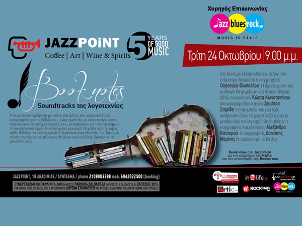 Οι βραδιές Booknotes κινούνται σε ρυθμούς τζαζ, μπλουζ, ροκ, πανκ, ηλεκτρονικής, δημοτικής, κλασικής μουσικής (και όποιου άλλου στυλ ζητά η λογοτεχνία) - με ελεύθερο τζαμάρισμα και παζλ μουσικών επιλογών μέχρι πρωτότυπες συνθέσεις και μελοποίηση˙ στο Jazz Point, όπου οι τέχνες ανοίγουν μεταξύ τους διάλογο και κάθε βιβλίο βρίσκει τη μουσική του.