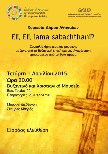 O Οργανισμός Πολιτισμού, Αθλητισμού και Νεολαίας του Δήμου Αθηναίων στο πλαίσιο των εκδηλώσεών του «Πάσχα στην Αθήνα 2015» παρουσιάζει την Χορωδία του Δήμου Αθηναίων στη συναυλία “Eli, Eli, lama sabachthaniΆ” την Τετάρτη 1 Απριλίου στις 8μ.μ. στο Βυζαντινό και Χριστιανικό Μουσείο.