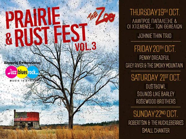 Το Prairie & Rust Fest πραγματοποιείται για τρίτη συνεχή χρονιά και τείνει πλέον να γίνει θεσμός. Το φετινό, τετραήμερο Prairie & Rust Fest Vol. 3 φιλοξενείται από τις 19 έως τις 22 Οκτωβρίου στη σκηνή του The ZOO. Αυτή τη φορά διευρύνεται και συσπειρώνει στις γραμμές του εννέα από τα πιο γνωστά ανεξάρτητα συγκροτήματα της πόλης, που κουβαλάνε στις αποσκευές τους την τεράστια μουσική παράδοση της "άλλης" Αμερικής, φιλτραρισμένη μέσα από τον θαμπό ορίζοντα της Αθήνας του 2017.