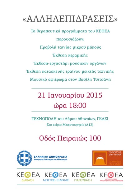 Μουσική, εικαστικά, εφαρμοσμένες τέχνες και κινηματογράφος συναντώνται στην εκδήλωση που διοργανώνουν το Υπουργείο Πολιτισμού και Αθλητισμού, το ΚΕΘΕΑ και η ΤΕΧΝΟΠΟΛΗ του Δήμου Αθηναίων, την Τετάρτη 21 Ιανουαρίου 2015, στο κτίριο Μηχανουργείο (Δ12) στην Τεχνόπολη στο Γκάζι.
