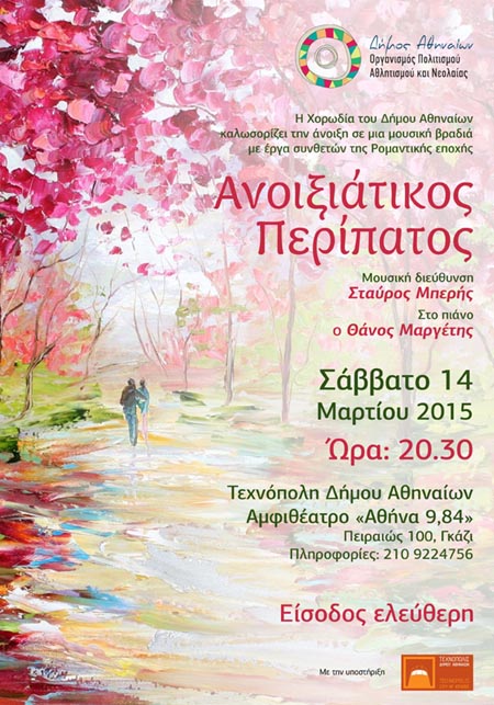 Ο Οργανισμός Πολιτισμού, Αθλητισμού και Νεολαίας του Δήμου Αθηναίων υποδέχεται την άνοιξη με τη συναυλία της Χορωδίας «Ανοιξιάτικος Περίπατος» το Σάββατο 14 Μαρτίου στις 8.30μ.μ. στο Αμφιθέατρο του «Αθήνα 9.84» της Τεχνόπολης του Δήμου Αθηναίων και καλεί το κοινό να απολαύσει μία μοναδική μουσική βραδιά εμπνευσμένη από τη Ρομαντική εποχή της κλασικής μουσικής.