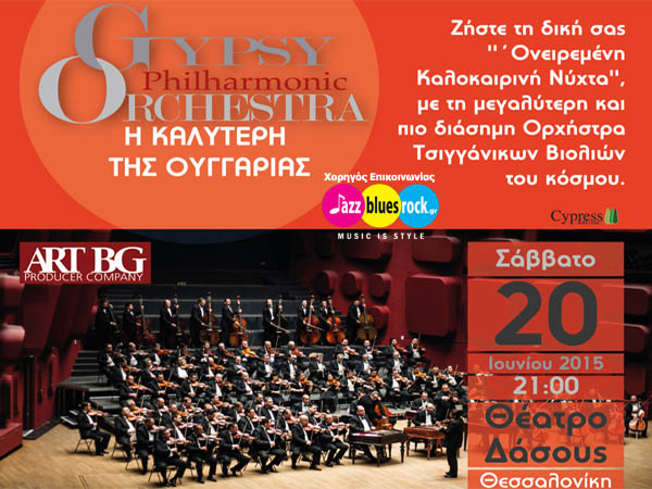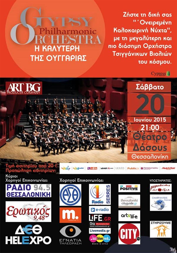 Η ART BG Producer Company ανακοινώνει σχετικά με τη συναυλία της Gypsy Philharmonic Orchestra (Τσιγγάνικα Βιολιά της Ουγγαρίας με 90 κορυφαίους μουσικούς) που θα γίνει στη Θεσσαλονίκη, στο Θέατρο Δάσους, το Σάββατο 20 Ιουνίου 2015, ότι εντάσσεται, στο πρόγραμμα των εκδηλώσεων του 1ου Φεστιβάλ Δάσους, του νέου μεγάλου πολιτιστικού γεγονότος της πόλης, που φέρει την υπογραφή του Κρατικού Θεάτρου Βόρειου Ελλάδας.