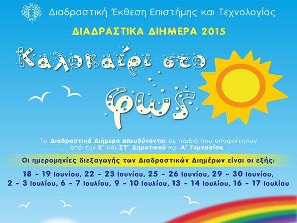 Το 2015 είναι το Διεθνές Έτος Φωτός! Αυτό το καλοκαίρι στα Διαδραστικά Διήμερα θα «ρίξουμε άπλετο φως» στα βασικά χαρακτηριστικά και στις ιδιότητές του! Παράλληλα, θα αναρωτηθούμε γιατί βλέπουμε χρώματα και τι συμβαίνει όταν μας ξεγελούν τα μάτια μας! Μέσα από πειράματα, εργαστήρια, παιχνίδια και κατασκευές θα αναζητήσουμε όλα τα στοιχεία που κάνουν το φως τόσο ξεχωριστό για τη ζωή μας. Την δεύτερη ημέρα, στην τελετή λήξης, οι γονείς θα παρακολουθήσουν έναν πρωτότυπο διαγωνισμό στον οποίο τα παιδιά καλούνται να συμπεριφερθούν όπως το φως!