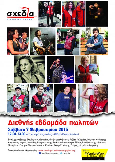 Οι συγγραφείς Βασίλης Αλεξάκης και Αύγουστος Κορτώ, οι ηθοποιοί Μανώλης Μαυροματάκης, Γιολάντα Μπαλαούρα, Γιώργος Πυρπασόπουλος, Γιούλικα Σκαφιδά, Φώτης Σπύρος και από το χώρο της μουσικής, η Ελευθερία Αρβανιτάκη, ο Φοίβος Δεληβοριάς, η Λιζέτα Καλημέρη, ο Μάρκος Κούμαρης, η Νατάσσα Μποφίλιου, ο Πάνος Μουζουράκης και η Μαριέττα Φαφούτη, με το περιοδικό δρόμου «σχεδία» ανά χείρας θα είναι αυτό το Σάββατο 7 Φεβρουαρίου (12:00-13:00) σε κεντρικά «πόστα» σε Αθήνα και Θεσσαλονίκη για να στείλουν το δικό τους μήνυμα κατά της φτώχειας και του κοινωνικού αποκλεισμού.