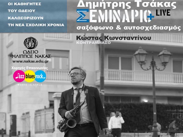 Ο Τομέας Μοντέρνας Μουσικής του Ωδείου Φίλιππος Νάκας έχει πολλούς λόγους να περηφανεύεται για τους καθηγητές του. Ο Δημήτρης Τσάκας είναι από τους πλέον προικισμένους σαξοφωνίστες της χώρας μας και η συνεργασία του με το Ωδείο Φίλιππος Νάκας, από τα χρόνια της μαθητείας του έως σήμερα είναι πολύτιμη. Το Ωδείο καλωσορίζει τη νέα σχολική χρονιά! Σεμινάριο "Σαξόφωνο και αυτοσχεδιασμός" στις 2 Οκτωβρίου, ώρα 7 μ.μ., Ιπποκράτους 41, Αθήνα. Θα ακολουθήσει μικρό live με τον κοντραμπασίστα και καλλιτεχνικό διευθυντή του Τομέα Μοντέρνας Μουσικής, Κώστα Κωνσταντίνου.