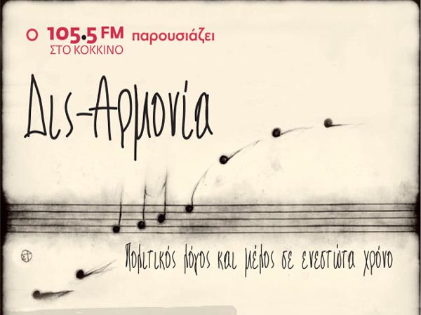 Ο 105,5 Στο Κόκκινο παρουσιάζει για πρώτη φορά τη Δις-Αρμονία. Ειδικά γραμμένα πρωτότυπα μουσικά έργα για το σήμερα από δέκα σύγχρονους Έλληνες συνθέτες πάνω σε πεζά πολιτικά και λογοτεχνικά κείμενα, με άμεσο ή έμμεσο πολιτικό περιεχόμενο, που θα παρουσιαστούν για πρώτη φορά στο Ωδείο Αθηνών συνοδεία της δωδεκαμελούς, για αυτή την περίσταση, Καμεράτα – Ορχήστρα Των Φίλων Της Μουσικής που θα διευθύνει η διεθνούς φήμης μαέστρος Ζωή Ζενιώδη και θα συμπράξουν διακεκριμένοι σολίστ.