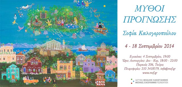 Το Ίδρυμα Μιχάλης Κακογιάννης καλωσορίζει τη νέα σαιζόν με την Έκθεση Ζωγραφικής "Μύθοι Πρόγνωσης" της Σοφίας Καλογεροπούλου από την Πέμπτη 4 έως Πέμπτη 18 Σεπτεμβρίου 2014. Εγκαίνια: Πέμπτη 4 Σεπτεμβρίου 2014, στις 19:00