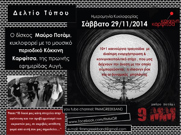 Το ελληνόφωνο, progressive, rock, metal, συγκρότημα 9mm σε συνεργασία με το μουσικό περιοδικό «Κόκκινη Καρφίτσα», ένθετο στην Πρωϊνή Εφημερίδα Αυγή, κυκλοφορεί το 2ο προσωπικό album με τίτλο «Μαύρο Ποτάμι», στις 29/11/2014.