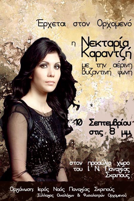 Τραγούδια της Μεσογείου και αρχέγονα μέλη της Ελληνικής παράδοσης με βυζαντινά ηχοχρώματα με τη φωνή της διεθνώς αναγνωρισμένης ερμηνεύτριας της βυζαντινής εκκλησιαστικής μουσικής, του ιερού μέλους και των παραδοσιακών τραγουδιών του κόσμου, θα συνοδεύσουν την εορταστική επέτειο της διάσωσης του Ορχομενού από τα γερμανικά στρατεύματα το 1943. Η συναυλία θα πραγματοποιηθεί στις 10 Σεπτεμβρίου, ώρα 20:00, στον προαύλιο χώρο του ιστορικού Ιερού Ναού της Παναγίας της Σκριπους, ενός από τα πιο σημαντικά εκκλησιαστικά μνημεία της Ελλάδας που χρονολογείται από τον 9ο αι.