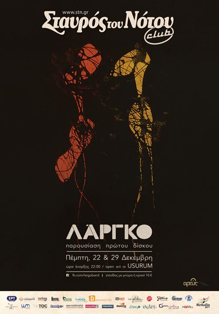 Οι ΛΑΡΓΚΟ έρχονται στο Club του Σταυρού του Νότου για δύο μόνο παραστάσεις, την Πέμπτη 22 & 29 Δεκεμβρίου. Θα μας παρουσιάσουν τον πρώτο τους δίσκο με τίτλο ΛΑΡΓΚΟ καθώς και τραγούδια που τους έχουν προσανατολίσει μουσικά.