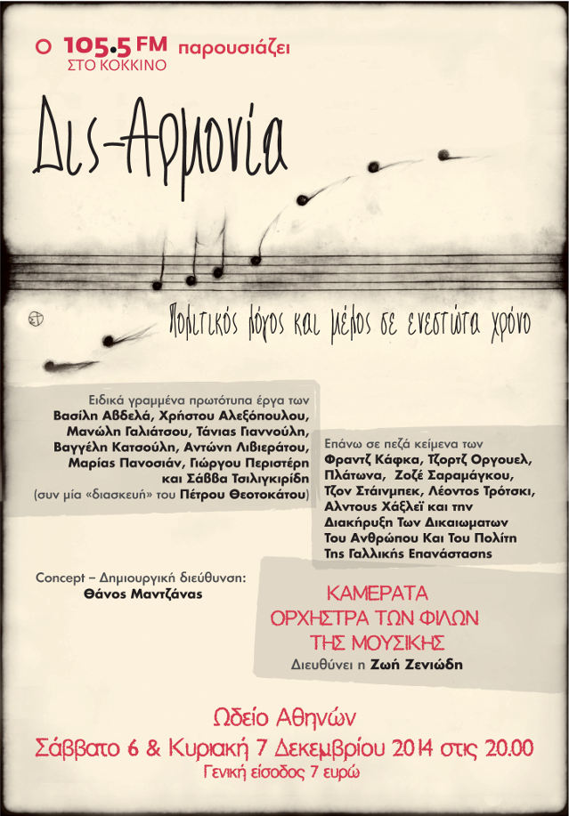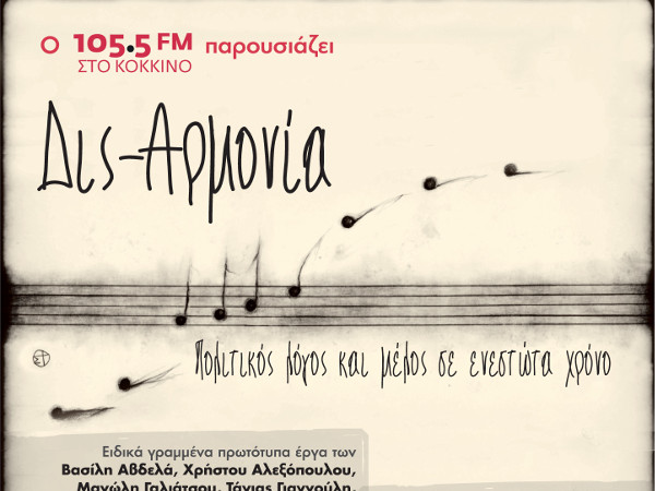 Ο 105,5 Στο Κόκκινο παρουσιάζει για πρώτη φορά τη Δις-Αρμονία. Ειδικά γραμμένα πρωτότυπα μουσικά έργα για το σήμερα από δέκα σύγχρονους Έλληνες συνθέτες πάνω σε πεζά πολιτικά και λογοτεχνικά κείμενα, με άμεσο ή έμμεσο πολιτικό περιεχόμενο, που θα παρουσιαστούν για πρώτη φορά στο Ωδείο Αθηνών συνοδεία της δωδεκαμελούς, για αυτή την περίσταση, Καμεράτα – Ορχήστρα Των Φίλων Της Μουσικής που θα διευθύνει η διεθνούς φήμης μαέστρος Ζωή Ζενιώδη και θα συμπράξουν διακεκριμένοι σολίστ.