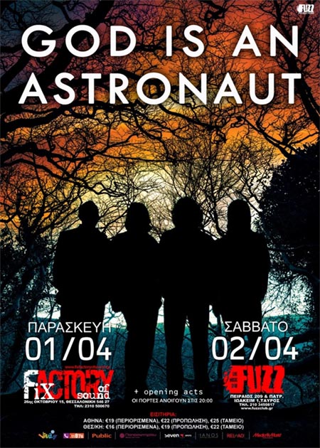 Οι God Is An Astronaut, μία από τις κορυφαίες instrumental μπάντες του πλανήτη τα τελευταία χρόνια, επιστρέφουν στη χώρα μας! Οι Ιρλανδοί post-rockers θα πραγματοποιήσουν δύο μεγάλες συναυλίες την Παρασκευή 1 Απριλίου στο Fix Factory of Sound στη Θεσσαλονίκη και το Σάββατο 2 Απριλίου στο Fuzz Live Music Club στην Αθήνα!