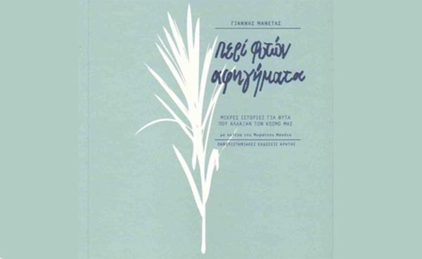 H παρουσίαση του βιβλίου: «Περί Φυτών Αφηγήματα: Μικρές ιστορίες για φυτά που άλλαξαν τον κόσμο μας» του Γιάννη Μανέτα, Ομότιμου Καθηγητή στο Τμήμα Βιολογίας του Πανεπιστημίου Πατρών, πραγματοποιείται την Πέμπτη 21 Μαΐου 2015 και ώρα 18:30, από τη Βιβλιοθήκη του Ιδρύματος Ευγενίδου (Λεωφ. Συγγρού 387, 175 64 Π. Φάληρο, είσοδος από οδό Πεντέλης 11).