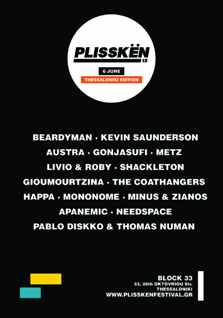 Στις 6 Ιουνίου, το Plisskën επιστρέφει στη Θεσσαλονίκη και παρουσιάζει ένα ολοκληρωμένο μονοήμερο line-up απαρτιζόμενο απο καλλιτέχνες όπως Gonjasufi, Beardyman, Austra και Metz μαζί με τους Kevin Saunderson, Shackleton και άλλους εκλεκτούς καλεσμένους οι οποίοι θα εμφανιστούν αποκλειστικά στη Θεσσαλονίκη, δημιουργώντας ένα άκρως πολυσυλλεκτικό show!