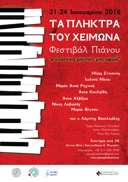 Η Αστική Μη Κερδοσκοπική Εταιρεία Piano Plus Festival σε συνεργασία με το Τμήμα Μουσικών Σπουδών του Ιονίου Πανεπιστημίου ενώνουν τις δυνάμεις τους και παρουσιάζουν το φεστιβάλ πιάνου ‘Τα Πλήκτρα του Χειμώνα’ την περίοδο 21 με 24 Ιανουαρίου 2016 στο Αττικό Ωδείο στο Παγκράτι (Ερατοσθένους 8). Πρόκειται για ένα φεστιβάλ κλασσικής μουσικής όπου θα παρουσιαστούν τρία ρεσιτάλ πιάνου από τους φοιτητές του Τμήματος Μουσικών Σπουδών του Ιονίου Πανεπιστημίου και τον καθηγητή τους-διεθνώς αναγνωρισμένο πιανίστα- κ. Λάμπη Βασιλειάδη. Το φεστιβάλ έχει καθαρό μορφωτικό και εκπαιδευτικό χαρακτήρα μιας και η φιλοσοφία του Piano Plus Festival είναι να δίνει τη δυνατότητα σε νέους μουσικούς και φοιτητές πανεπιστημίων να παρουσιάσουν το καλλιτεχνικό τους έργο.