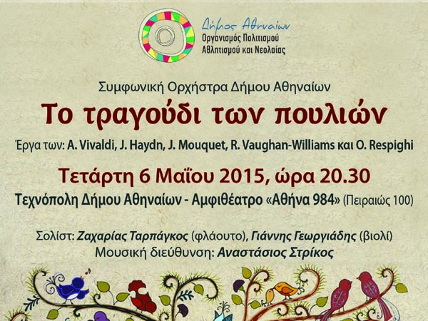 Ο Οργανισμός Πολιτισμού, Αθλητισμού και Νεολαίας του Δήμου Αθηναίων παρουσιάζει, την Τετάρτη 6 Μαΐου στις 8.30μ.μ. στην Τεχνόπολη, τη Συμφωνική Ορχήστρα του Δήμου Αθηναίων σε μία συναυλία εμπνευσμένη από τις μελωδίες της φύσης με τίτλο «Το τραγούδι των πουλιών».