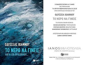 Οι εκδόσεις Πατάκη παρουσιάζουν στον ΙΑΝΟ το βιβλίο του Οδυσσέα Ιωάννου με τίτλο «Το νερό να γίνεις»...