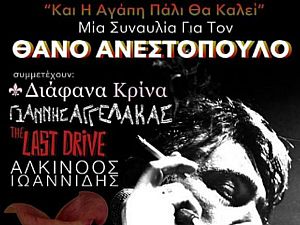 ΜΙΑ ΣΥΝΑΥΛΙΑ ΓΙΑ ΤΟΝ ΘΑΝΟ ΑΝΕΣΤΟΠΟΥΛΟ ΣΥΜΜΕΤΕΧΟΥΝ: ΔΙΑΦΑΝΑ ΚΡΙΝΑ, ΓΙΑΝΝΗΣ ΑΓΓΕΛΑΚΑΣ, THE LAST DRIVE, ΑΛΚΙΝΟΟΣ ΙΩΑΝΝΙΔΗΣ