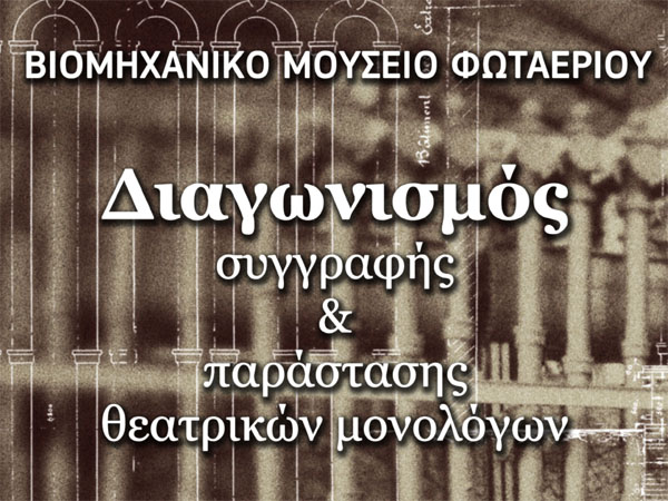 Το Βιομηχανικό Μουσείο Φωταερίου θα ήθελε να ενημερώσει τους ενδιαφερόμενους του διαγωνισμού «Το Θέατρο στο Βιομηχανικό Μουσείο Φωταερίου» ότι δίνεται παράταση στην τελική ημερομηνία για την υποβολή των μονολόγων. Οι υποψήφιοι μπορούν να υποβάλουν τους μονολόγους μέχρι τις 4/4/2014 μόνο σε ηλεκτρονική μορφή μέχρι τις 23:59μμ., χωρίς να αναγράφεται το όνομά τους. Τα στοιχεία των καλλιτεχνών θα αναγράφονται στη φόρμα που θα σταλεί ηλεκτρονικά μαζί με το μονόλογο.