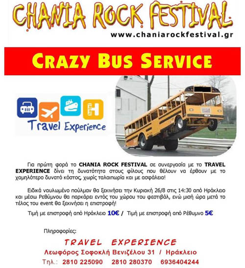 Για πρώτη φορά το CHANIA ROCK FESTIVAL σε συνεργασία με το TRAVEL EXPERIENCE δίνει τη δυνατότητα στους φίλους που θέλουν να έρθουν με το χαμηλότερο δυνατό κόστος, χωρίς ταλαιπωρία και με ασφάλεια!