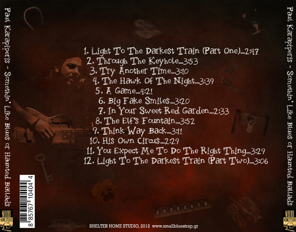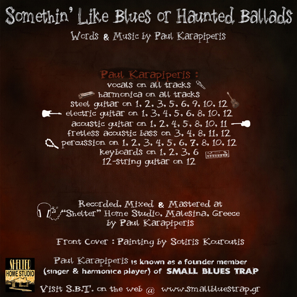 Το “Somethin’ Like Blues or Haunted Ballads” είναι το δεύτερο προσωπικό album του Παύλου Καραπιπέρη, τραγουδιστή και αρμονικίστα του συγκροτήματος Small Blues Trap, μετά το “Fifteen Raindrops In An Ocean Of Blues Tales” του 2009. Μια Underground παραγωγή που δίνει το στίγμα της ξεκινώντας me to “Light To The Darkest Train”. Τυποποιώντας τα blues με ένα μουσικό κρεσέντο και αναδύοντας μια δυνατή μυρωδιά Νότιου ήχου και υγρασίας νομίζεις ότι κινείσαι ανάμεσα σε καλαμιώνες και απέραντες φυτείες σταχυολογώντας τις πολυτιμότερες νότες του πενταγράμμου. Για τους μυημένους αυτό το blues αποτελεί ένα είδος μυσταγωγίας που οδηγεί από το απόλυτο μαρτύριο στη λύτρωση κάτι που έρχεται μέσα από το “The Elf’s Fountain”. Το “You Expect Me To Do the Right Thing” ισοδυναμεί με μια ατέρμονη και συνάμα ιδεατή κατάσταση διαχωρισμού των συναισθημάτων όπως και στο “Through the Keyhole”. Στο “Try Another Time” η άμορφη επανάληψη της δεύτερης κιθάρας (τουλάχιστον στην εισαγωγή) μας δένει την εντύπωση πως όλα σε αυτό τον κόσμο είναι απλά για να ταιριάζουνε και να δένουν μεταξύ τους. Μια χαρισματική σύνθεση που εμένα τουλάχιστον μου φέρνει στο μυαλό συνθέσεις του εμβληματικού Ennio Morricone είναι το “The Hawk of The Night” ενώ το “Big Fake Smiles” εγώ θα το χαρακτήριζα ως ένα psychedelic blues sound. Στο ίδιο μοτίβο και με όμορφα φωνητικά καλύπτεται το “In Your Sweet Red Garden”. Τέλος το “Think Way Back” και το “His Own Circus” έρχονται να συμπληρώσουν το ένα το άλλο. Σε γενικές γραμμές πάντως το νέο αυτό προσωπικό άλμπουμ του Παύλου Καραπιπέρη είναι ακόμα πιο «φιλοσοφημένο μουσικά» και ταυτόχρονα πιο «δύσκολο» για τα μη εκπαιδευμένα αυτιά.