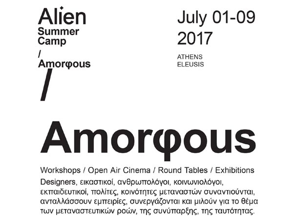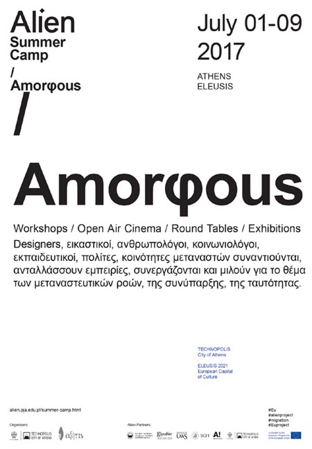 Στο πλαίσιο του Alien project, η Τεχνόπολη Δήμου Αθηναίων, σε συνεργασία με την Ελευσίνα 2021-Πολιτιστική Πρωτεύουσα της Ευρώπης, διοργανώνει το Amorφous, ένα summer camp διάρκειας 9 ημερών, με διεπιστημονικά workshops, events και εκθέσεις στην πόλη της Ελευσίνας.