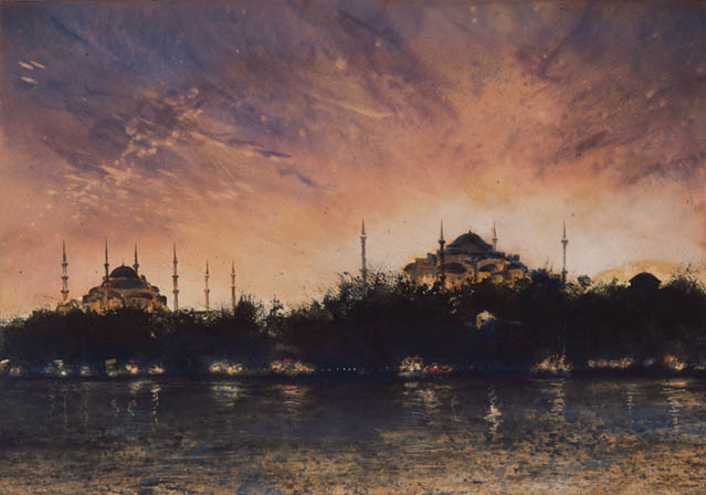 Μετά τη Βενετία και την Αλεξάνδρεια, ο ζωγράφος μάς ταξιδεύει σε μια ακόμη εμβληματική πόλη, την Κωνσταντινούπολη, επιλέγοντας αυτή τη φορά να εμπνευστεί από την ίδια την Ιστορία και αποτυπόνωντας μόνο τα σημεία εκείνα που σώθηκαν από τη φθορά του χρόνου και υπάρχουν ακόμη και σήμερα εκεί.