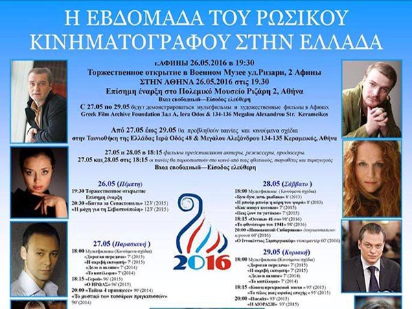 Αγαπητοί φίλοι, σας ενημερώνουμε, ότι από τις 20 έως 28 Μαΐου, στο πλαίσιο της Χρονιάς της Ελληνορωσικής φιλίας για το 2016, με τη στήριξη του Υπουργείου Πολιτισμού Ρωσίας, του Υπουργείου Εξωτερικών Ελλάδας, του Υπουργείου Πολιτισμού Ελλάδας, της Πρεσβείας της Ρωσίας στην Ελλάδα, του Γενικού Πρόξενου της Ρωσίας στη Θεσσαλονίκη, των Δήμων Αθηνών και Θεσσαλονίκης θα διεξαχθεί η «Εβδομάδα ρωσικού κινηματογράφου στην Ελλάδα».