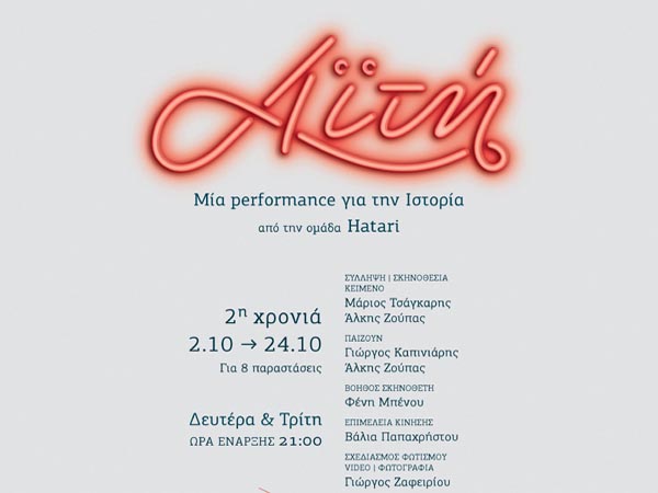 Μετά τη μεγάλη ανταπόκριση του κοινού την περασμένη άνοιξη, η ομάδα Hatari επιστρέφει για 2η χρονιά στο Κέντρο Ελέγχου Τηλεοράσεων με την παράσταση Αϊτή. Μία performance για την Ιστορία. Με κύριο και αποκλειστικό εργαλείο την ερώτηση, η Ιστορία του νεοελληνικού κράτους γίνεται πεδίο προβληματισμού, έρευνας και παιχνιδιού αλλά και σημείο αντίστιξης με το ανιστορικό και επίπεδο παρόν.