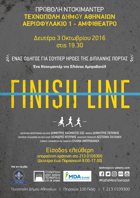Μετά τη μεγάλη επιτυχία που σημείωσε το ντοκιμαντέρ «Ο Τερματισμός» (“Finishline”), σε σκηνοθεσία Ελιάνας Αμπραβανέλ, στο 18ο Φεστιβάλ Ντοκιμαντέρ Θεσσαλονίκης, και την επίσημη πρεμιέρα του στον κινηματογράφο ΔΑΝΑΟ, θα πραγματοποιηθεί προβολή σε συνεργασία με τo MDA Ελλάς, Σωματείο για τη φροντίδα των ατόμων με νευρομυικές παθήσεις, στην Τεχνόπολη του Δήμου Αθηναίων, τη Δευτέρα 3 Οκτωβρίου, στοχεύοντας στην ευαισθητοποίηση του ευρύτερου κοινού απέναντι σε «σπάνια» παιδιά και νέους.