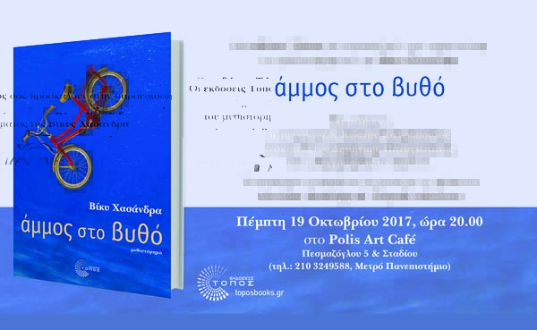 Οι εκδόσεις ΤΟΠΟΣ σας προσκαλούν στην παρουσίαση του μυθιστορήματος της Βίκυς Χασάνδρα «Άμμος στο Βυθό». Θα μιλήσουν ο συγγραφέας Κώστας Καλφόπουλος, ο σκηνοθέτης Δημήτρης Παναγιωτάτος και η συγγραφέας του βιβλίου. Τα πρόσωπα του βιβλίου ζωντανεύουν οι ηθοποιοί Λεωνίδας Κακούρης και Τζωρτζίνα Κώνστα.