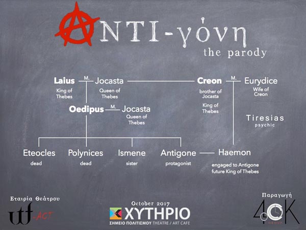 Μία σύγχρονη κωμωδία βασισμένη πλήρως στο μύθο της Αντιγόνης και αντλώντας στοιχεία από την τραγωδία του Σοφοκλή, ο συγγραφέας και σκηνοθέτης του έργου, δημιούργησε ένα νέο πρωτότ...υπο κείμενο, που στόχο του έχει την ψυχαγωγία του κοινού, όπου μέσα από την διακωμώδηση διατηρεί την κεντρική ιδέα της τραγωδίας, σχετικά με αξίες όπως αυτήν της οικογένειας, της σχέσης του ανθρώπου με την εξουσία, θίγοντας κοινωνικοπολιτικά ζητήματα του τότε και του σήμερα. Ηθοποιοί: Κωνσταντίνος Τζηλίνης, Στεφέλενα Κόνιαρη, Θοδωρής Κατσαρός, Στέλα Καπετάνιου, Ελένη Βρυώνη, Μέμος Ρούσσος, Σουέλεν Κωνσταντινίδου. Εναρξη Δευτέρα 16 Οκτωβρίου 2017