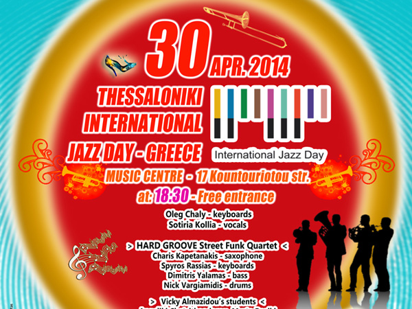 Ο Σύλλογος "Φίλοι της Τζαζ & Δημιουργικής Μουσικής" (Association of Jazz & Creative Music) και η Διεύθυνση Πολιτισμού Τουρισμού του Δήμου Θεσσαλονίκης υπό την αιγίδα της Πολιτείας Πολιτισμού και την υποστήριξη των Υπουργείων Παιδείας και Θρησκευμάτων καθώς και του Υπουργείου Μακεδονίας Θράκης, διοργανώνει την εκδήλωση "ΠΑΓΚΟΣΜΙΑ ΗΜΕΡΑ JAZZ ΜΟΥΣΙΚΗΣ (ΔΙΕΘΝΗΣ ΗΜΕΡΑ JAZZ / UNESCO / THELONIUS MONK INSTITUTE OF JAZZ)" στο χώρο του Κέντρου Μουσικής του Δήμου Θεσσαλονίκης, Κουντουριώτου 17 και ώρα 18:30 την Τετάρτη 30 Απριλίου 2014