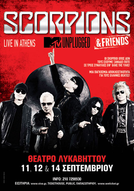 Ο Σεπτέμβριος του 2013 θα είναι μια σημαντική στιγμή για τους Scorpions, αλλά και για τους Έλληνες θεατές. Τρεις πολύ ξεχωριστές συναυλίες στην Αθήνα, για το MTV Unplugged, θα μαγνητοσκοπηθούν για να μείνουν στην ιστορία, αφού το DVD θα κυκλοφορήσει σε 47 χώρες. Τρεις συναυλίες με ένα μοναδικό project το οποίο θα παρουσιαστεί αποκλειστικά στην Ελλάδα!