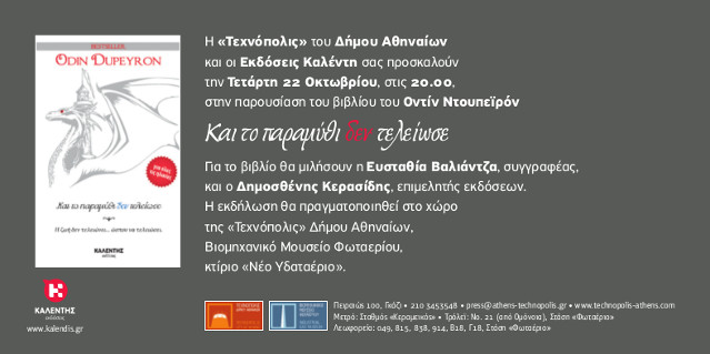 Μια εξαιρετική ιστορία για τη ζωή, τους κρυμμένους φόβους που μας παραλύουν και την επιθυμία μας για ελευθερία, θα παρουσιαστεί στις 22 Οκτωβρίου στην Τεχνόπολη του Δήμου Αθηναίων, στις 20.00, μέσα από το βιβλίο του Odin Dupeyron «Και το παραμύθι δεν τελείωσε», το οποίο κυκλοφορεί από τις Εκδόσεις Καλέντη.